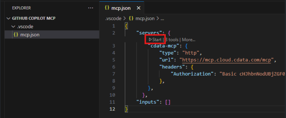 .vscode in your project repository. Within this folder, create a file named mcp.json and add the following configuration. Replace YOUR_BASE64_ENCODED_EMAIL:PAT with the Base64-encoded value of email:PAT that you created in the prerequisites.Click Start within your IDE to start the MCP server. If the MCP server starts without error, it displays Running.