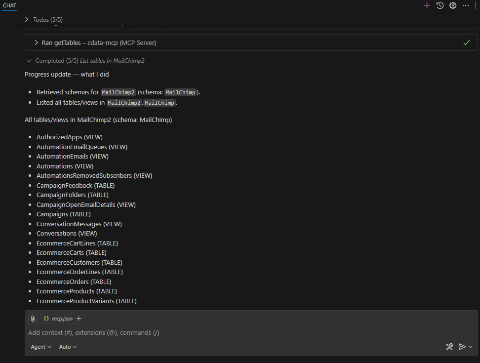 You can now chat with GitHub Copilot and issue contextual prompts. As a test, you can provide the MCP server with a simple prompt, such as a list of tables for a particular connection. GitHub Copilot uses the Connect AI tools such asgetCatalogs, getSchemas, and getTables to retrieve data from the connected data source.
