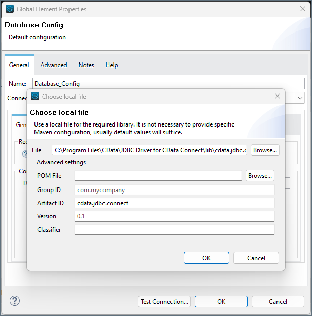 Click the Configure button to configure the JDBC driver. Select Use local file from the drop-down list.